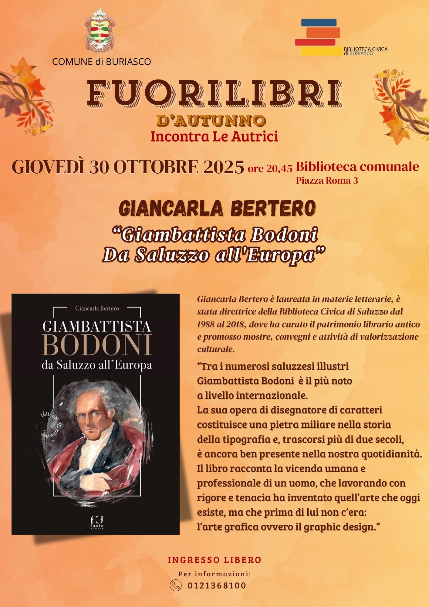 Giovedì 30 ottobre, alle ore 20:45, in biblioteca, Giancarla Bertero presenterà il libro "Giambattista Bodoni, da Saluzzo all'Europa".