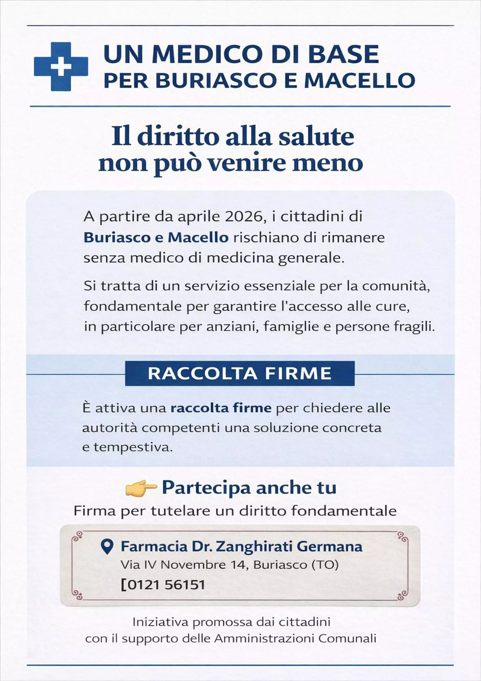 Finalizzata a richiedere alle Autorità competenti un intervento urgente per garantire la presenza di un medico di medicina generale sul territorio comunale. L'iniziativa nasce con l'obiettivo di tutelare concretamente il diritto all'assistenza sanitaria di prossimità e di rappresentare in modo chiaro le esigenze della comunità locale.