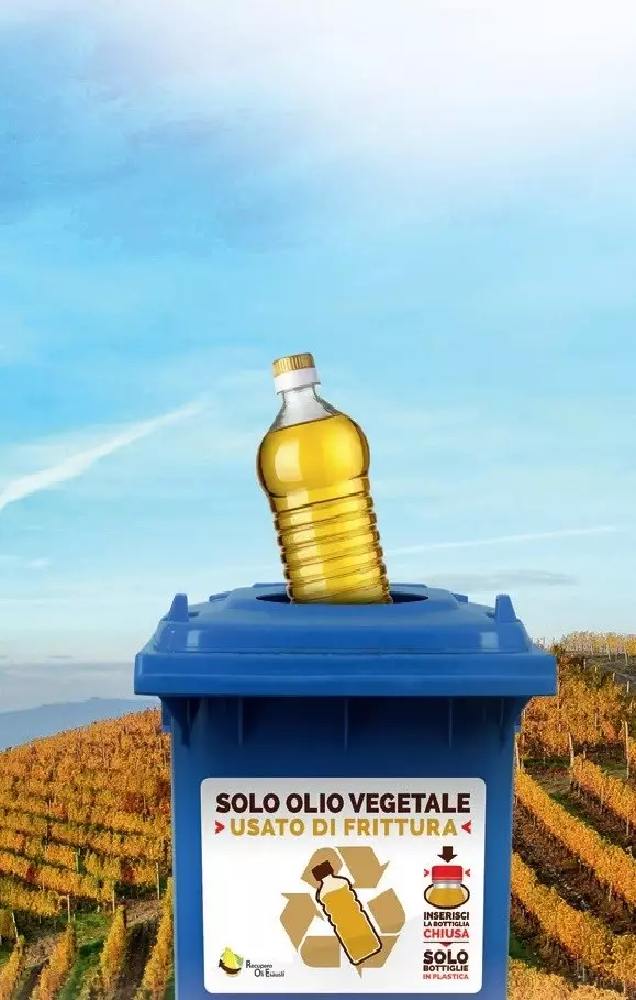 Le modalità di conferimento sono le seguenti: l’olio vegetale esausto proveniente dalle cucine dovrà essere messo all’interno di una bottiglia di plastica e gettata, rigorosamente chiusa, negli appositi bidoni della raccolta olio vegetale, come nella foto allegata.